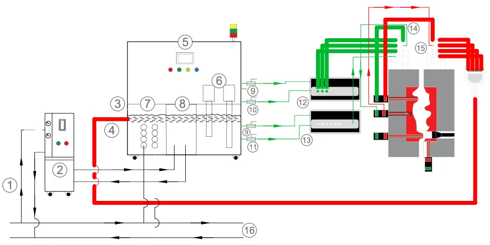 O equipamento oferece duas saídas de pressão diferentes: resfriamento localizado 0,6–1,2 MPa; resfriamento do molde 0,4–0,8 MPa.